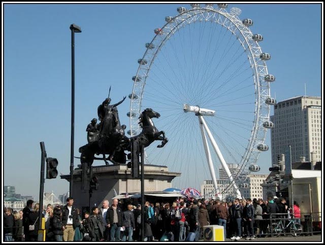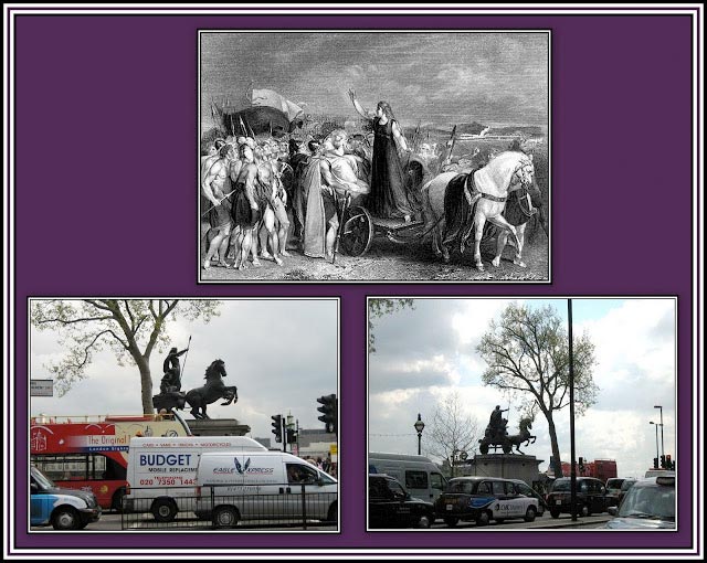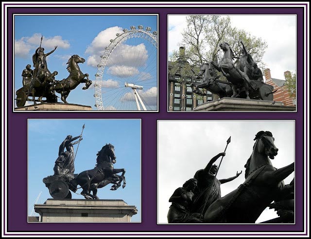 I have always liked this collage. I especially like the bottom photographs where it looks as if The Warrior Queen standing in her chariot is waiting at the traffic lights to turn green along with modern vehicles and is eager to take off into the future!
