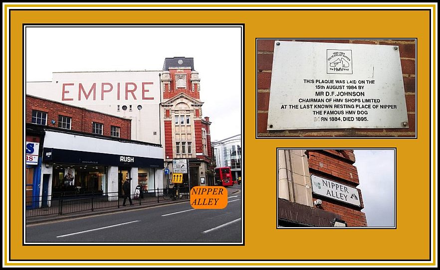 When Mr. Barraud died, Nipper went to live with Mr. Barraud’s brother, the painter, Francis Barraud (1856-1924) in London and remained with him until he died of natural causes in 1895. He was buried in a small park on Clarence Street (supposedly surrounded by magnolia trees) in Kingston-upon-Thames. Sadly over the years, the exact spot was lost. However, the branch of Lloyd’s Bank now present over the area, has a plaque on one of the outside walls of Nipper Alley, which runs down the side of the former Empire Theatre (1910-1955). What remains of the Theatre is now a public house.