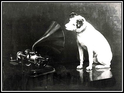 Perhaps the most dog to be associated with music is Nipper (1884 or 1885-1895), the His Master’s Voice (HMV) Dog.  The painting of the dog looking directly at the horn and seemingly listening to the Phonograph playing. The image became a worldwide Entertainment Trademark and is known throughout the world for its association with both the Electric and Musical Industries Ltd (EMI)/His Master’s Voice and Radio Corporation of America (RCA) Companies.