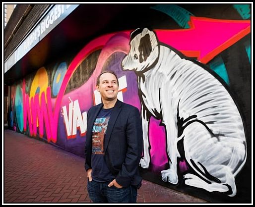 Doug Putman with Nipper outside the HMV Birmingham Vaults