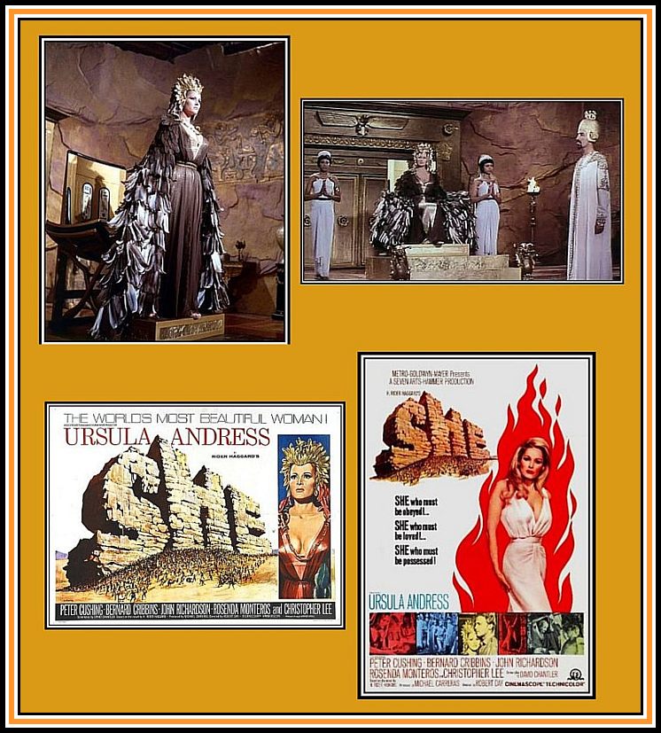 The story of SHE was re-made once more in 1965 and starred Ursula Andress (1936), as AYESHA, SHE WHO MUST BE OBEYED and featured Christopher Lee (1922-2015), as Billali, and Peter Cushing (1913-1994). The film was made by Hammer Film Productions Limited renown at the time for their horror films.